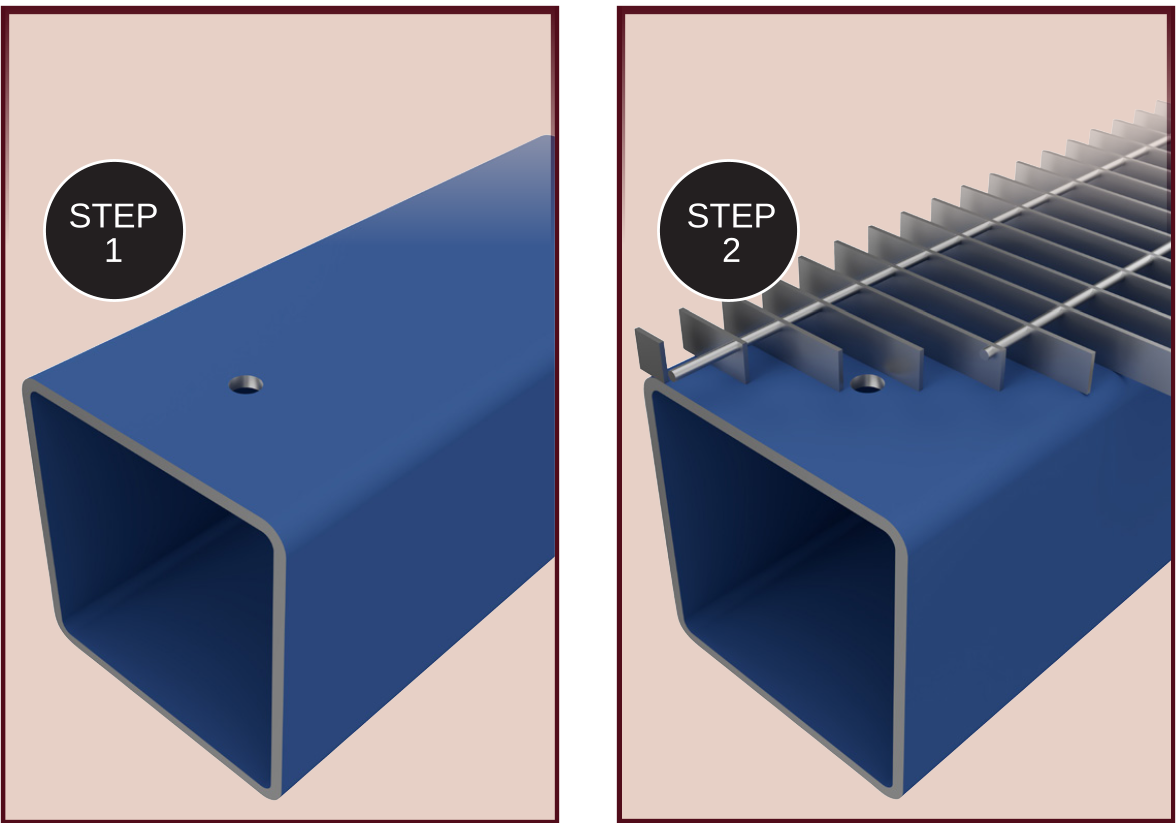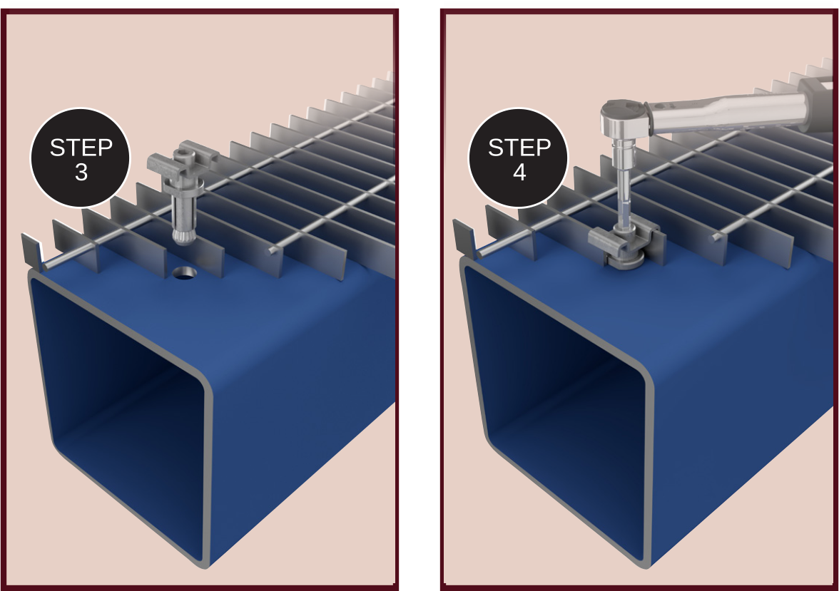 STEP 1: Ensure drilled hole is free from burrs. Coordinate hole location with bar grating spacing.